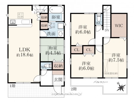 階数 区分 広さ 1F LDK 18.6帖 1F 和 4.5帖 2F 洋 7.5帖 2F 洋 6.0帖 2F 洋 6.0帖 - 駐車場