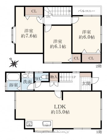 階数 区分 広さ 1F LDK 15.0帖 2F 洋 7.6帖 2F 洋 6.1帖 2F 洋 6.0帖 - 駐車場