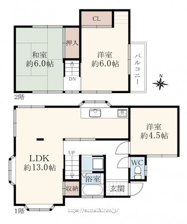 階数 区分 広さ 1F LDK 13.0帖 1F 洋 4.5帖 2F 洋 6.0帖 2F 和 6.0帖 - 駐車場