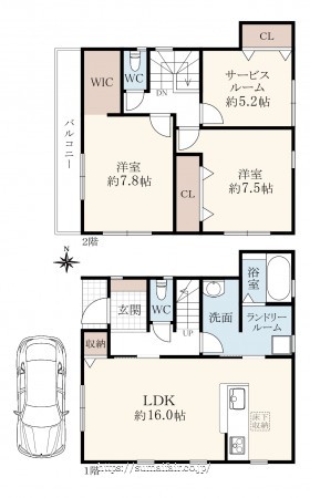 階数 区分 広さ 1F LDK 16.0帖 2F 洋 7.8帖 2F 洋 7.5帖 2F S 5.2帖 - 駐車場
