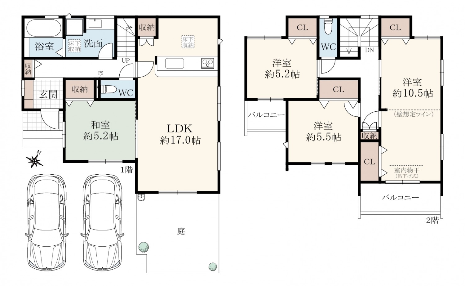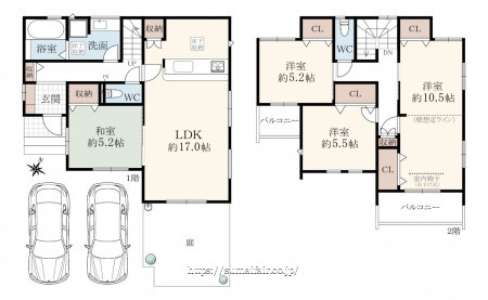 階数 区分 広さ 1F LDK 17.0帖 1F 和 5.2帖 2F 洋 10.5帖 2F 洋 5.5帖 2F 洋 5.2帖 - 駐車場