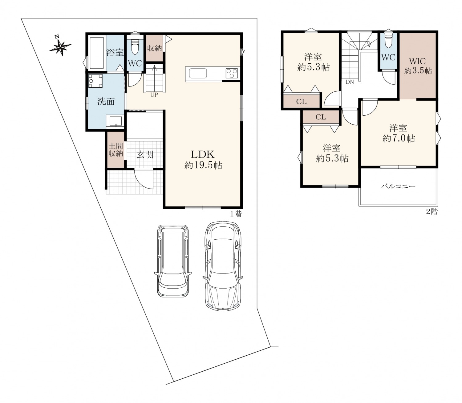 階数 区分 広さ 1F LDK 19.5帖 2F 洋 7.0帖 2F 洋 5.3帖 2F 洋 5.3帖 - 駐車場