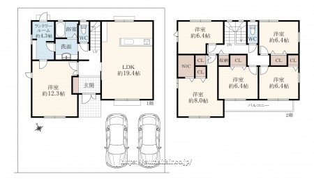 階数 区分 広さ 1F LDK 19.4帖 1F 洋 12.3帖 2F 洋 8.0帖 2F 洋 6.4帖 2F 洋 6.4帖 2F 洋 6.4帖 2F 洋 6.4帖 - 駐車場