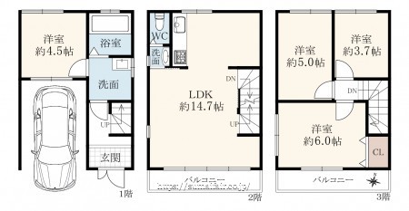 階数 区分 広さ 1F 洋 4.5帖 2F LDK 14.7帖 3F 洋 6.0帖 3F 洋 5.0帖 3F 洋 3.7帖 - 駐車場