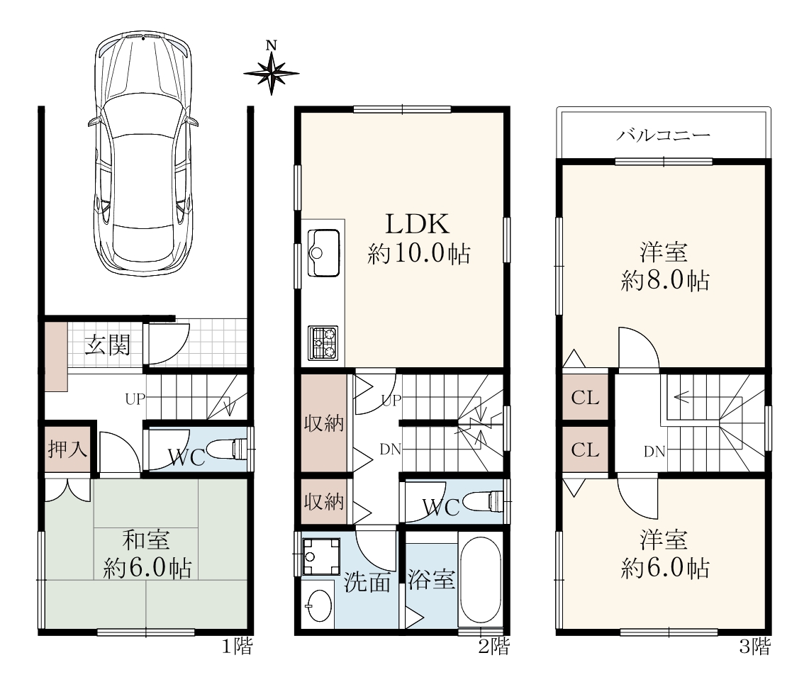 階数 区分 広さ 1F 和 6.0帖 2F LDK 10.0帖 3F 洋 8.0帖 3F 洋 6.0帖 - 駐車場