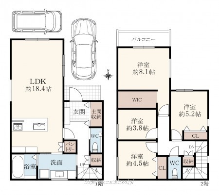 階数 区分 広さ 1F LDK 18.4帖 2F 洋 8.1帖 2F 洋 5.2帖 2F 洋 4.5帖 2F 洋 3.8帖 - 駐車場