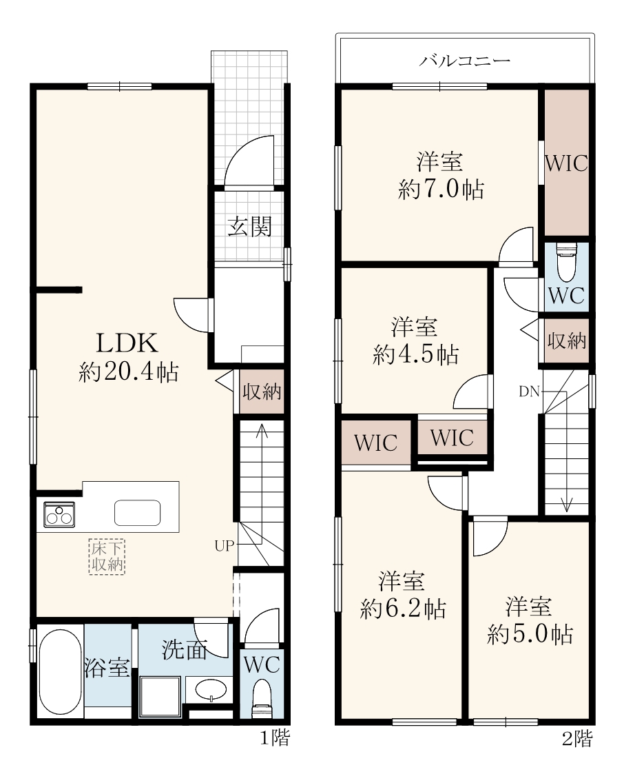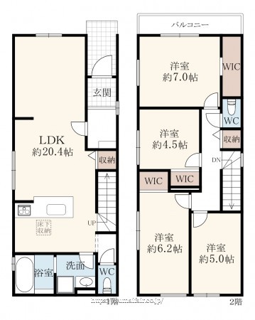 階数 区分 広さ 1F LDK 20.4帖 2F 洋 7.0帖 2F 洋 6.2帖 2F 洋 5.0帖 2F 洋 4.5帖 - 駐車場