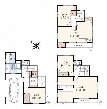 階数 区分 広さ 1F 洋 4.5帖 2F LDK 16.5帖 2F 洋 5.0帖 3F 洋 11.2帖 3F S 5.0帖 - 駐車場