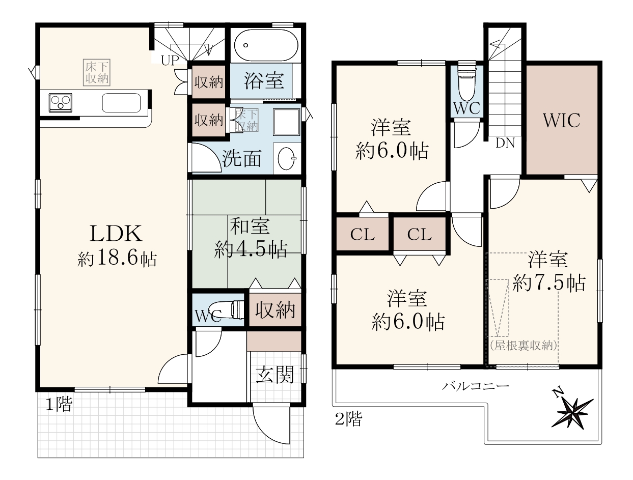 階数 区分 広さ 1F LDK 18.6帖 1F 和 4.5帖 2F 洋 7.5帖 2F 洋 6.0帖 2F 洋 6.0帖 - 駐車場