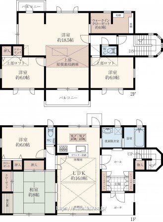 階数 区分 広さ 1F LDK 16.0帖 1F 和 8.0帖 1F 洋 6.0帖 2F 洋 18.5帖 2F 洋 6.0帖 2F 洋 6.0帖 2F S 4.0帖 - 駐車場