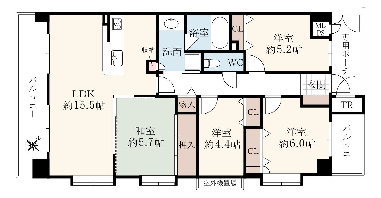 三方角部屋・5階部分につき、陽当たり・通風良好