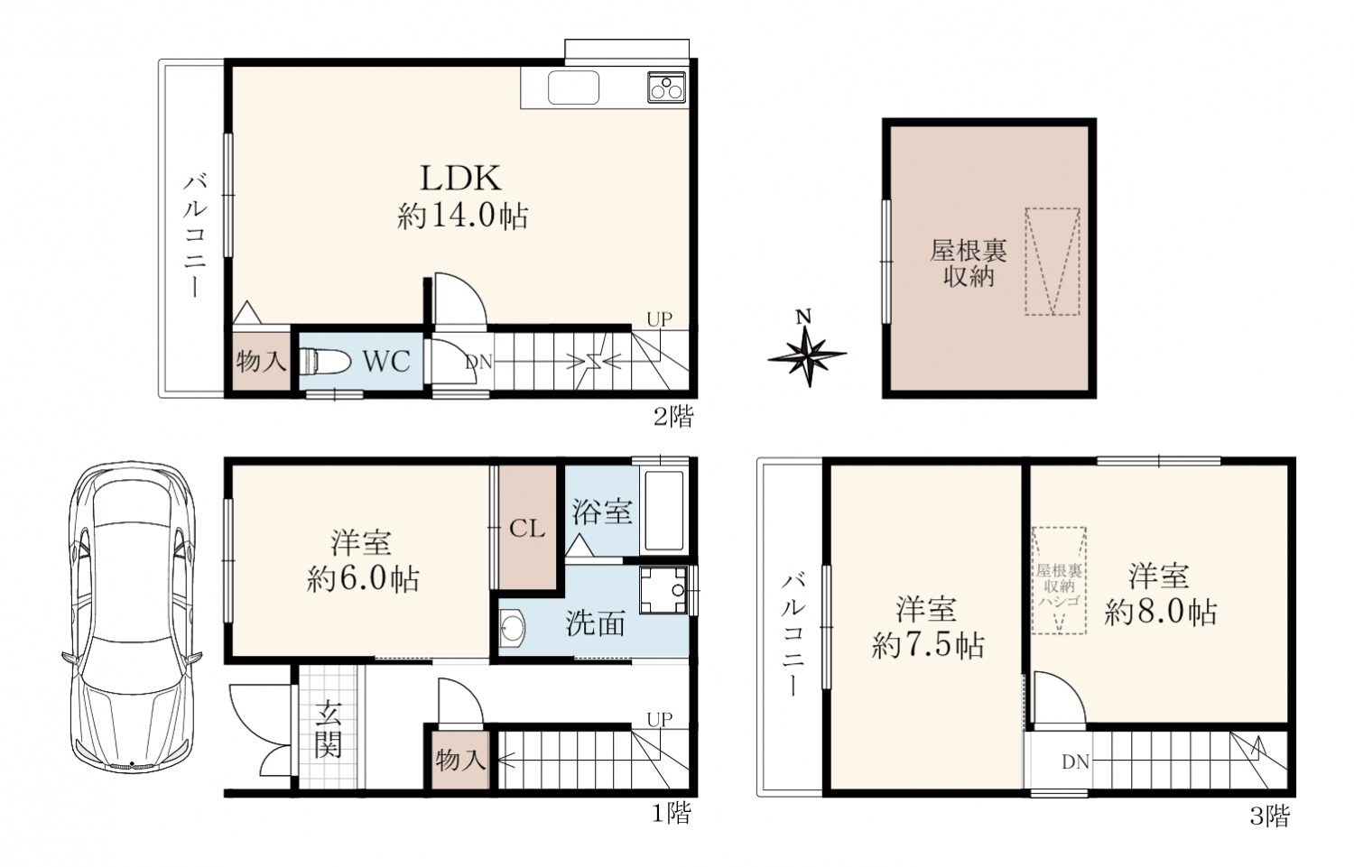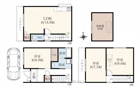 階数 区分 広さ 1F 洋 6.0帖 2F LDK 14.0帖 3F 洋 8.0帖 3F 洋 7.5帖 - 駐車場