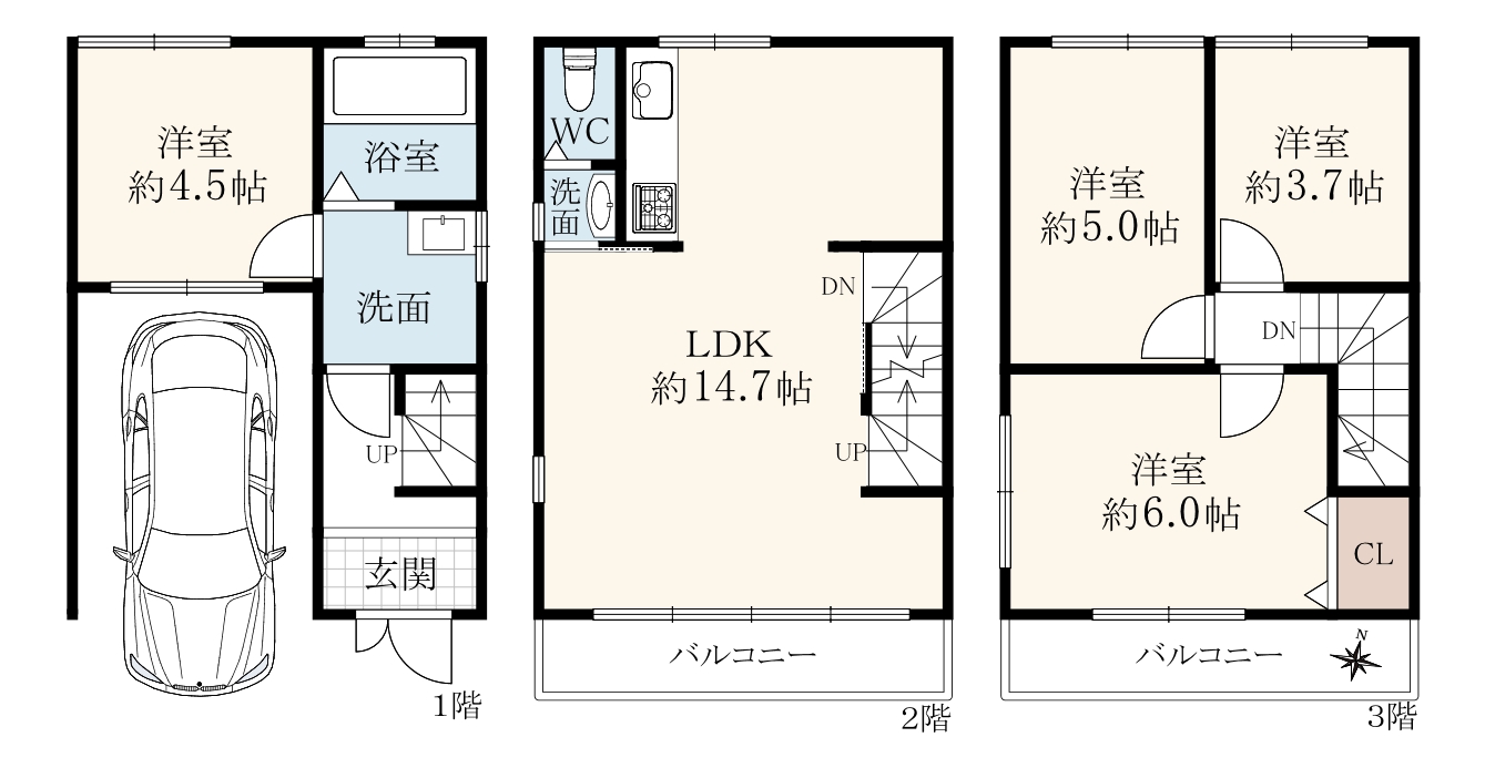 階数 区分 広さ 1F 洋 4.5帖 2F LDK 14.7帖 3F 洋 6.0帖 3F 洋 5.0帖 3F 洋 3.7帖 - 駐車場