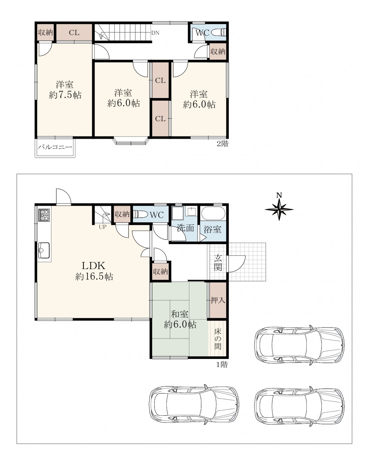 階数 区分 広さ 1F LDK 16.5帖 1F 和 6.0帖 2F 洋 7.5帖 2F 洋 6.0帖 2F 洋 6.0帖 - 駐車場